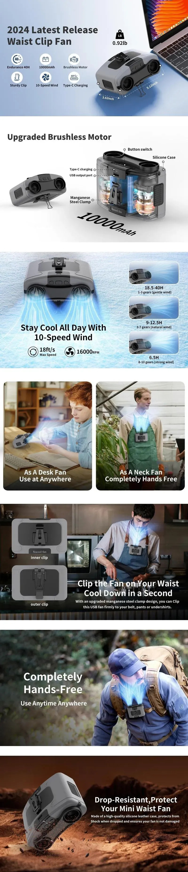 【Wearable Design】: The innovative wearable design, as a waist or neck fan, provides hands-free convenience and cooling on the move.