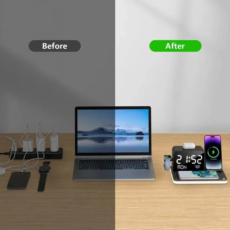 Wireless Charger iPhone 6 in 1 Charging Station, Charger Stand with Alarm Clock for 15/14/13/12/11 Series & AirPods & Apple Watch