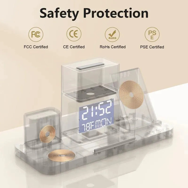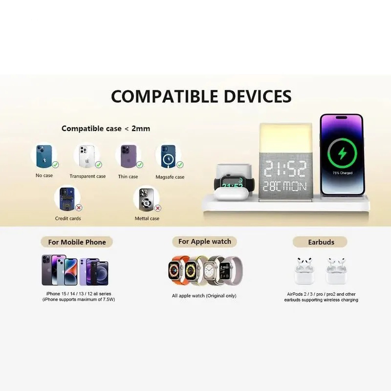 ●【Bluetooth Automatic Time Synchronization】- The biggest advantage of this wireless charging station is that it can automatically synchronize time through Bluetooth. The operation is very simple. Open the Bluetooth link on your mobile phone and find "009". The connection is successful and you can synchronize.In addition to synchronizing the time, you can also see the day of the week and the indoor temperature displayed on it.