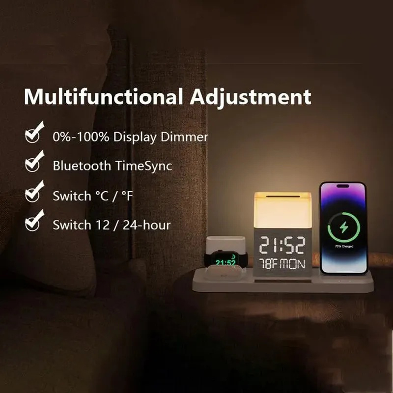 ●【Touch-adjustable Lighting】- The wireless charging station comes with 3 types of adjustable light: warm light, natural light and cold light. The brightness of the digital display time and temperature can also be adjusted through touch control. The adjustable brightness is 0%-100%, you can adjust it to the most Comfortable brightness, does not affect sleep.
